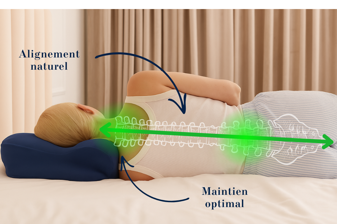 Oui. Sa forme ergonomique maintient les cervicales dans une position naturelle. En quelques jours, beaucoup ressentent une réduction nette des douleurs et une meilleure posture au réveil.